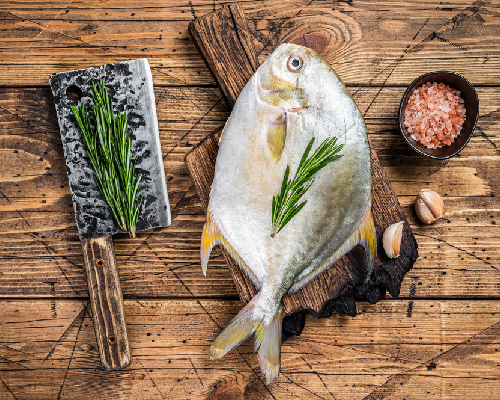 Golden Pomfret has a delicious and succulent taste. The silver side of the Golden pomfret is said to be delicious and easily edible as it does not require scaling. Though the fish is firm to touch, it can be easily filleted. Upon cooking the translucent flesh turns thick white. With the delicate and succulent flavor, Golden pomfret is a sought after and appreciated tropical fish. Golden pomfret has a good repute of “a clean tasting fish”. Many chefs believe that it is this sweetness of Golden pomfret that make them versatile to be used in a wide variety of cuisines. frequently used for broiling, sautéing, and in soup preparations.